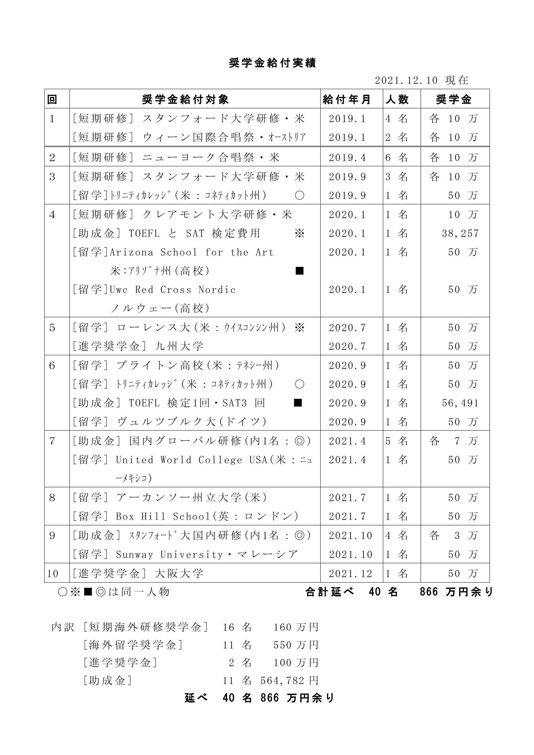 従来のアメリカやイギリスだけでなく、最近はマレーシア・ロシア、コロナ禍で実現しませんでしたがフィリピンなど、欧米だけでなくアジアにも留学等の視野を広げる傾向が見られることは、「グローバル人材を育成する」という財団の目標に叶うことで、心強く思っております。