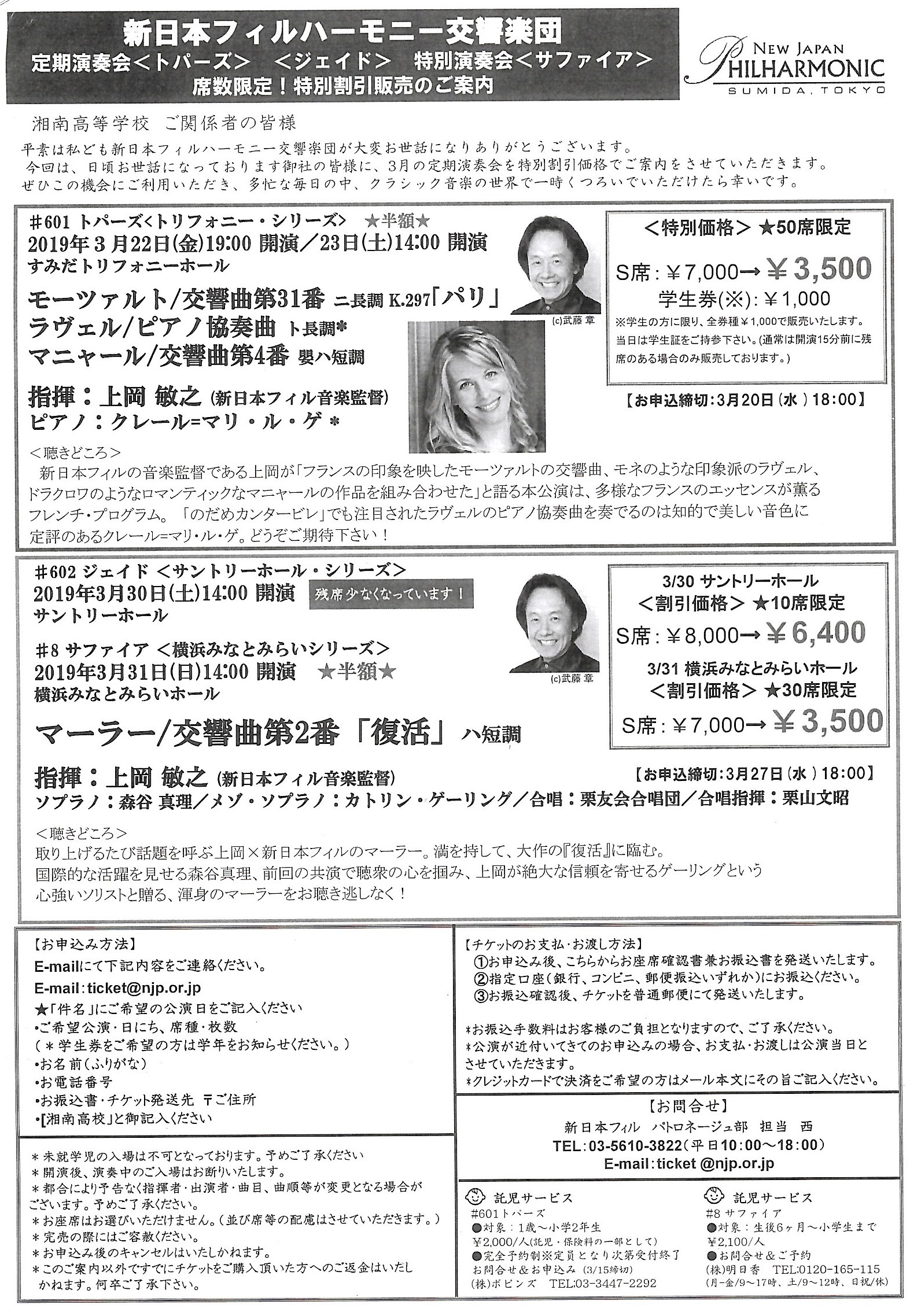 私は、上岡のホームページの管理をしていることなどから、新日本フィルに、チケットの割引等の企画のお願いをしていたところ、本年3月の3公演について、湘南高校関係者を対象とした半額または割引の企画のご連絡をいただきました。